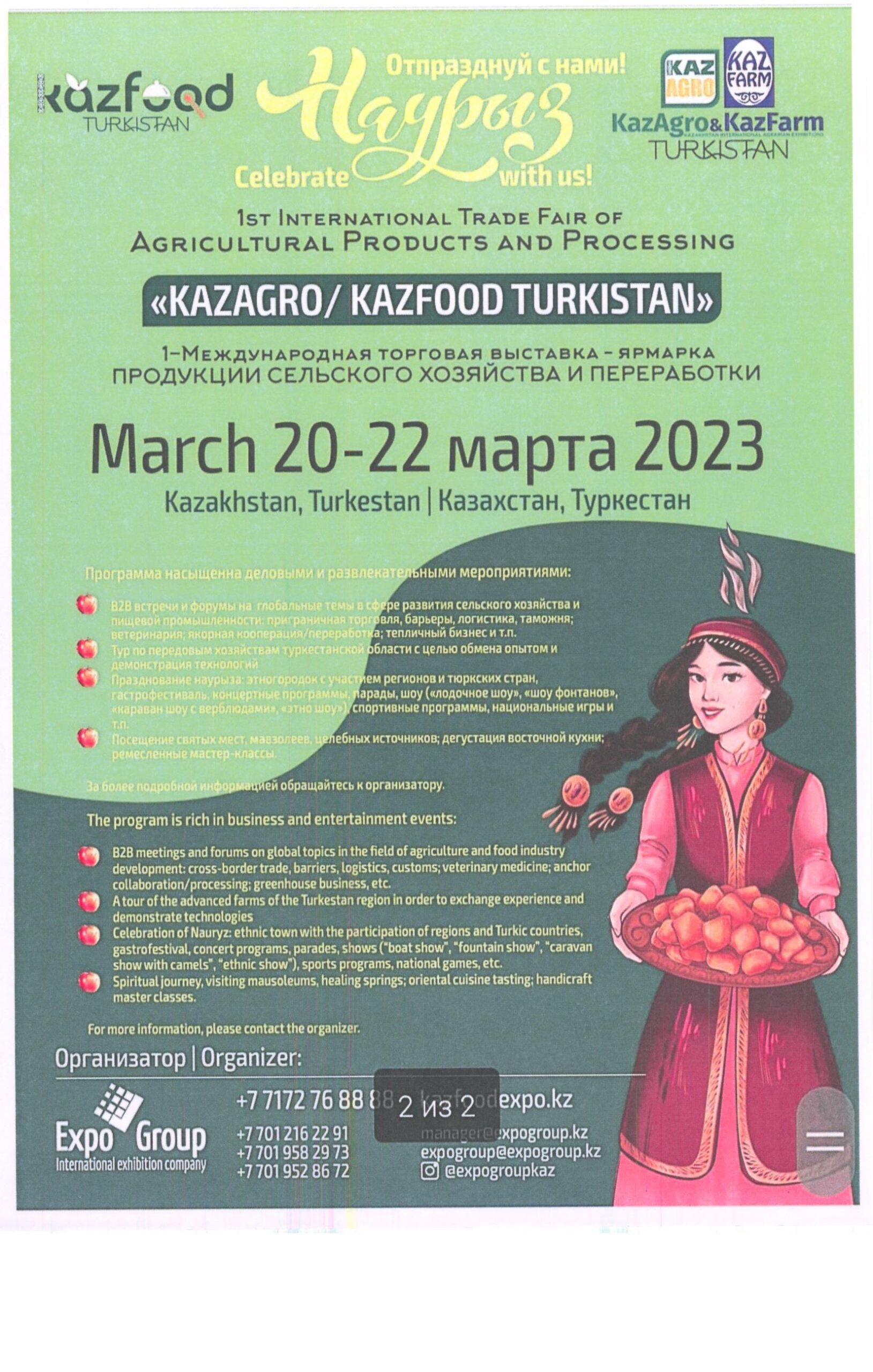 В период с 20 по 22 марта 2023 года в Республике Казахстан пройдет I Международная торговая выставка-ярмарка «KazAgro/KazFood Turkistan-2023». В рамках мероприятия пройдут сессии в области развития пищевой промышленности и сельского хозяйства.