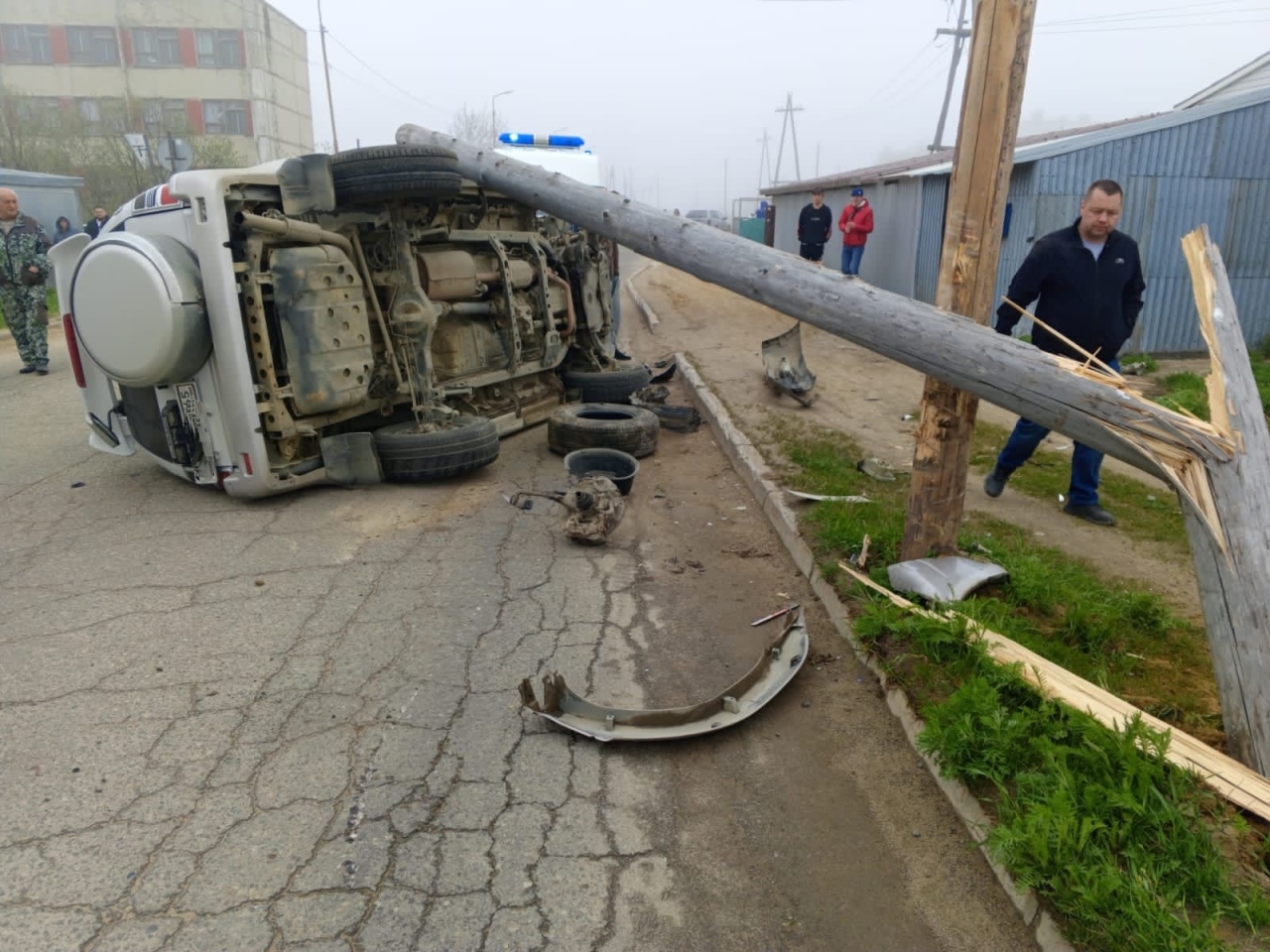 От удара джип совершил наезд на опору линии электропередач с последующим опрокидыванием, после чего опора рухнула на транспортное средство.