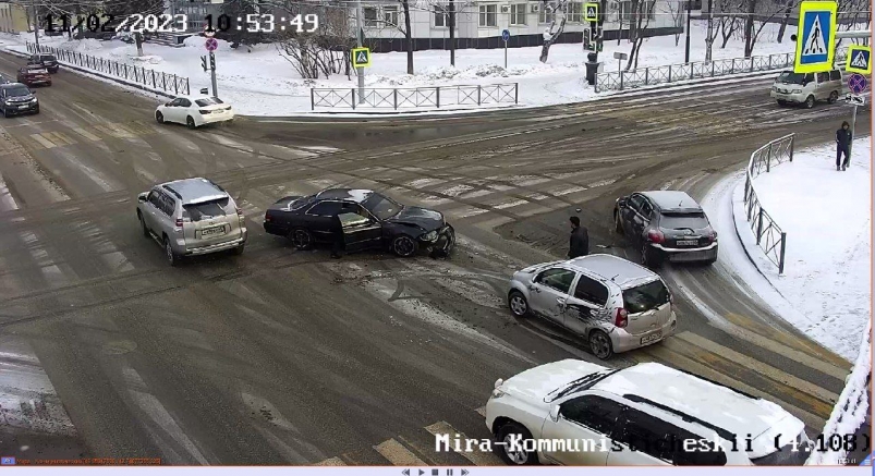 В субботу, 11 февраля, в Южно-Сахалинске произошло ДТП. Столкновение иномарок произошло в районе пересечения проспекта Мира и Коммунистического проспекта в 10.53. Момент аварии попал на видео, сообщает ИА SakhalinMedia.