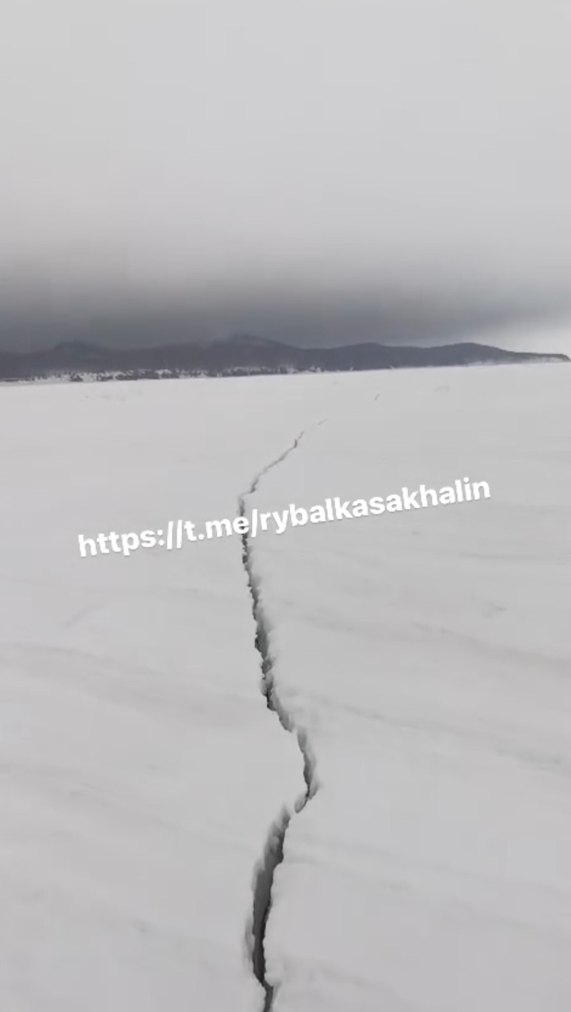Еще в одной группе «️Рыбалка Сахалин и ДВ» сообщили, что в Лесном треснул лед. В сообществе также опубликовали кадры разлома, который растянулся на километры.