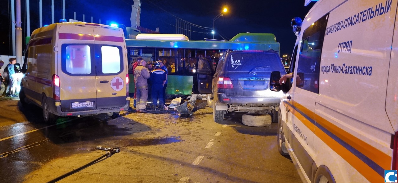 ЮЖНО-САХАЛИНСК, 25 августа, Citysakh.ru. В Хомутово на перекрёстке проспекта Мира и улицы Куропатко произошла страшная авария. Toyota Land Cruiser на полном ходу врезался в поворачивающий из аэропорта рейсовый автобус.