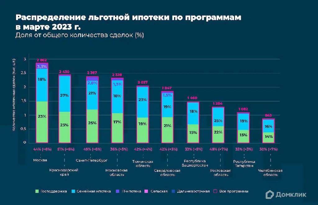 Спрос на льготную ипотеку продолжает оставаться высоким. В марте 2023 года доля выдач жилищных кредитов по программам с господдержкой увеличилась с 32 до 37% — максимум за первый квартал этого года. Столь высокое значение наблюдалось в декабре 2022 года (37%) на фоне повышенного спроса из-за возможной отмены программы «Господдержка» и в апреле-мае 2022 года (47%) из-за резкого увеличения ключевой ставки ЦБ.