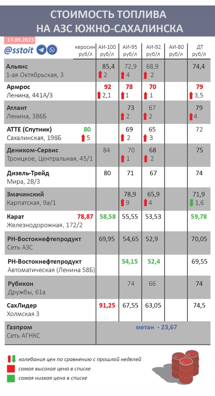 ЮЖНО-САХАЛИНСК, 23 сентября, Citysakh.ru. В областном центре продолжается рост цен на топливо. Вкупе с увеличением цен на газ для автомобилей, на автозаправочных станциях выросли цены за литр бензина. Информацию об этом сообщил telegram-канал « Стоит ».