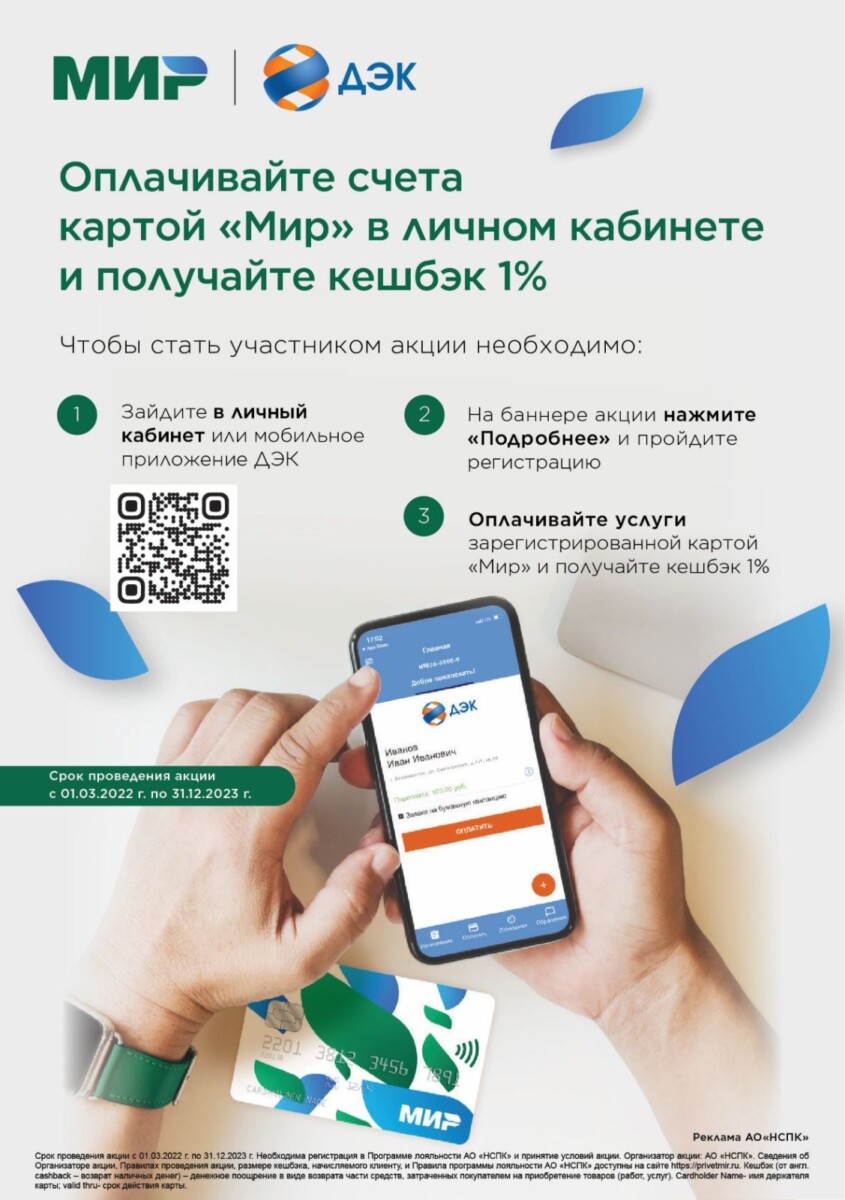 Зарегистрировать карту «Мир» в программе лояльности АО «НСПК» (оператор платежной системы «Мир») в Личном кабинете, мобильном приложении ПАО «ДЭК» либо по ссылке на privetmir.ru. Выразить согласие на участие в настоящей акции. Оплатить услуги в Личном кабинете на сайте ПАО «ДЭК» или в мобильном приложении зарегистрированной картой. Получить 1% кешбэка на карту «Мир» (кешбэк возвращается на карту, с которой был совершен платеж, в течение 5 – 7 рабочих дней с даты оплаты).Процент кешбэка по карте «Мир» суммируется к уже предоставляемым банками кешбэкам по иным акциям лояльности в соответствии с их правилами и условиями.