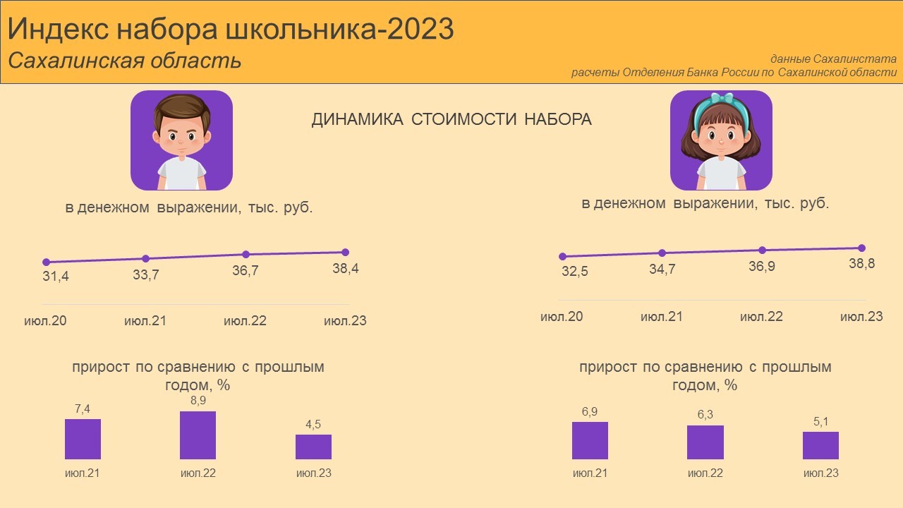 По подсчетам специалистов Банка России, набор для девочки обошелся в 38 774 рубля, для мальчика — в 38 352 рубля. По сравнению с июлем прошлого года стоимость набора для девочки возросла на 5,1%, а для мальчика — на 4,5%.
