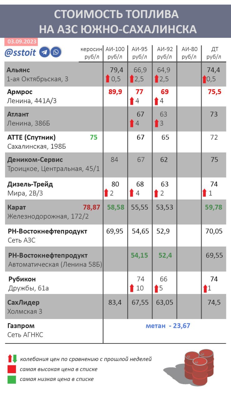ЮЖНО-САХАЛИНСК, 9 сентября, Citysakh.ru. В областном центре на некоторых заправочных станциях стоимость топлива выросла на десять рублей. Предельная цена на АИ-95 по итогам прошлой недели составила 77 рублей за литр, сообщил telegram-канал « Стоит ».