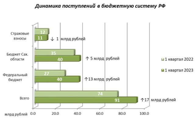 По состоянию на 01.04.2023 года поступления налогов, сборов и страховых взносов от налогоплательщиков Сахалинской области выросли к поступлениям первого квартала 2022 года на 17 млрд рублей (23%) и составили 91 млрд рублей.
