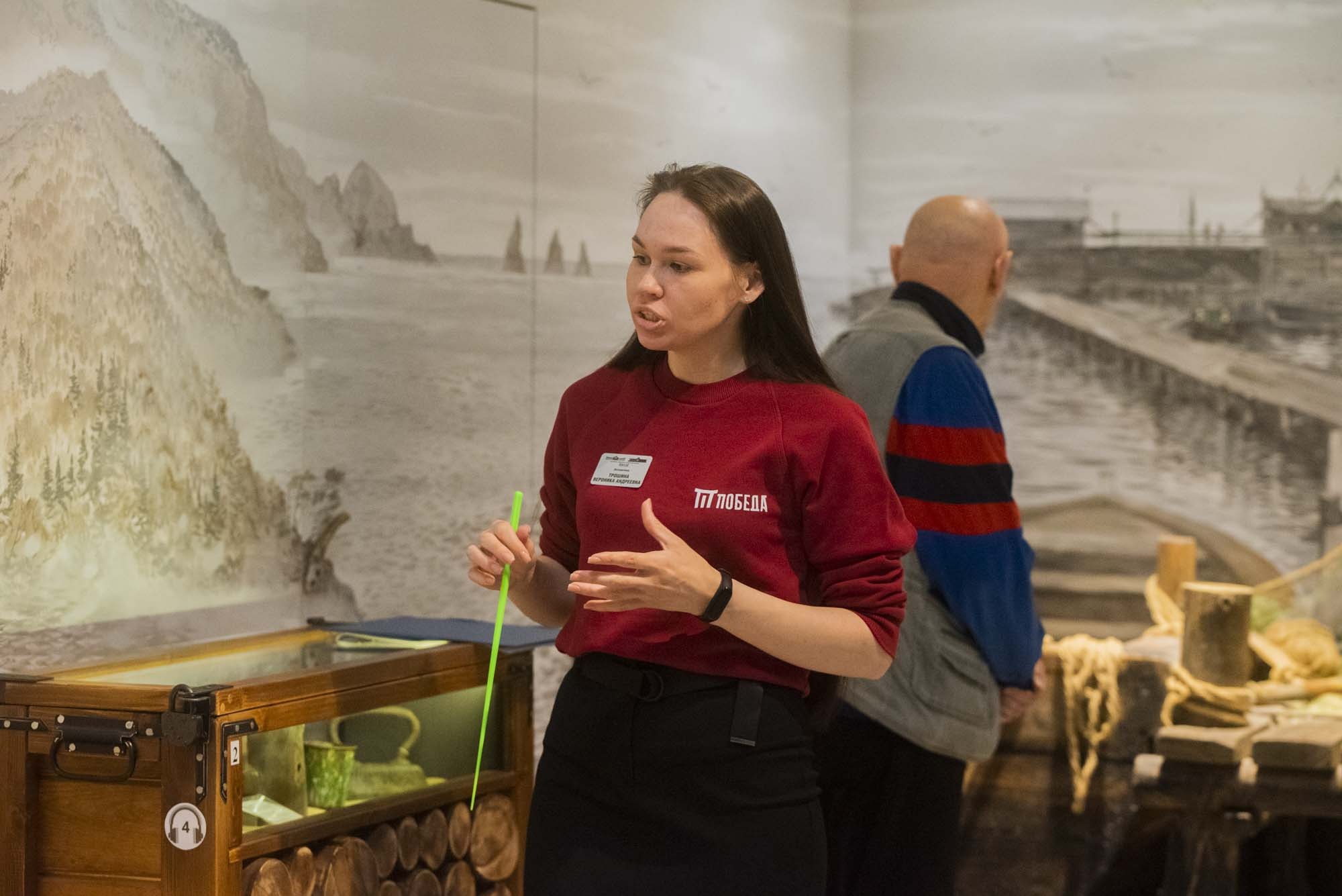 Культурная программа гостей музея началась с экскурсии по экспозиции «Сахалин в тылу». Экскурсовод рассказала о вкладе Северного Сахалина в Великую Победу советского народа. Не жалея сил, сахалинцы, не попавшие на фронт, днями и ночами работали не покладая рук: добывали нефть, уголь, лес, рыбу.