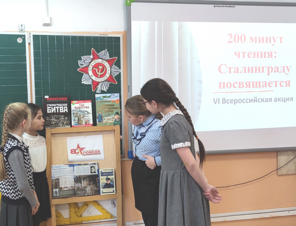 В этот день заведующая отделом ЦБС - библиотекой «Книга+» Е. Рожнева провела патриотический час «Битва за Сталинград» в рамках VI Всероссийской акции «200 минут чтения: Сталинграду посвящается», организованной МУК «Централизованная система детских библиотек» (г. Волгоград). Участниками акции стали ученики 4б класса МАОУ СОШ№31. Открыли акцию рассказом о событиях Сталинградской битвы, о подвигах защитников города, о тяжёлых боях на Мамаевом Кургане. Продолжилась акция чтением вслух произведений советского писателя С. Алексеева «Мамаев Курган», «Титаев», «Победа под Сталинградом». В завершение мероприятия ребята обсудили прочитанное и познакомились с книгами о Сталинградской битве.