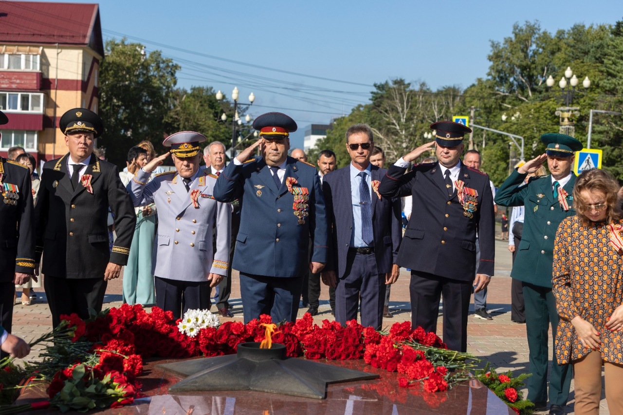 На площади Славы Южно-Сахалинска состоялись главные мероприятия праздника. Ветераны Великой Отечественной войны и ветераны боевых действий, военнослужащие, представители органов власти, общественности и духовенства возложили цветы к Вечному огню. Затем прошли парадные расчеты.