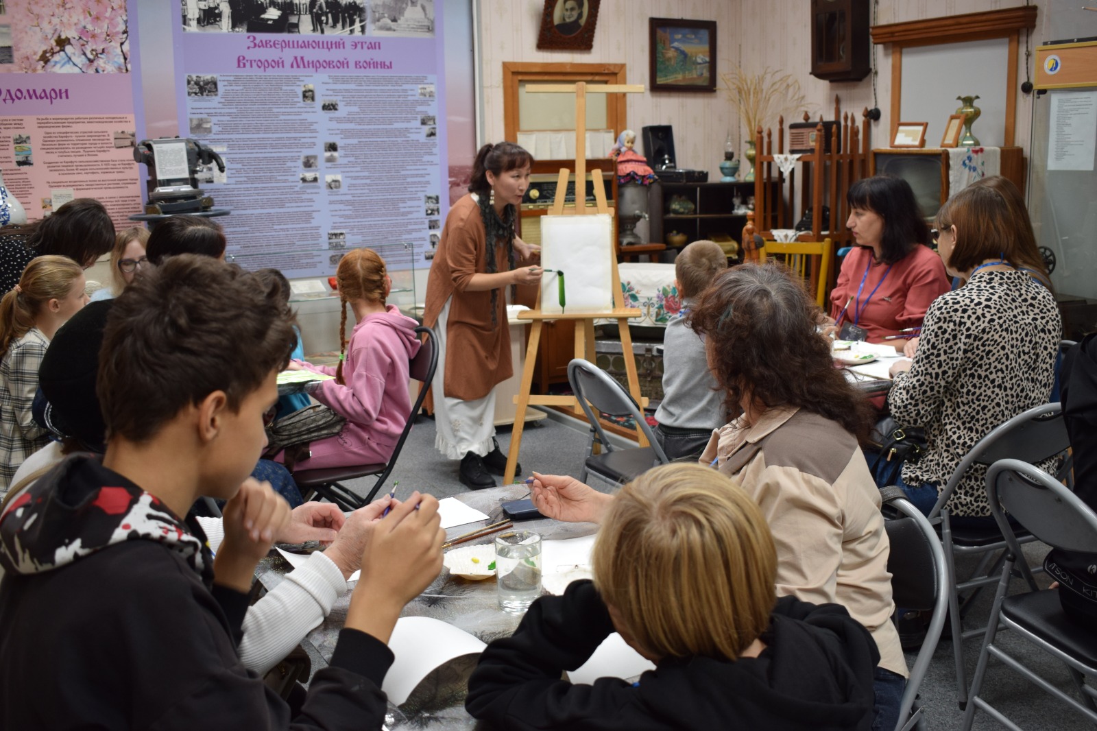 А пока шедевры подсыхали, гости отправились в другой зал, где педагог дополнительного образования Дома детства и юношества Татьяна Севостьянова познакомила с разными гуслями, рассказала о видах, их особенностях. И под аккомпанемент гуслей погрузила присутствующих в мир потешек и сказок.
