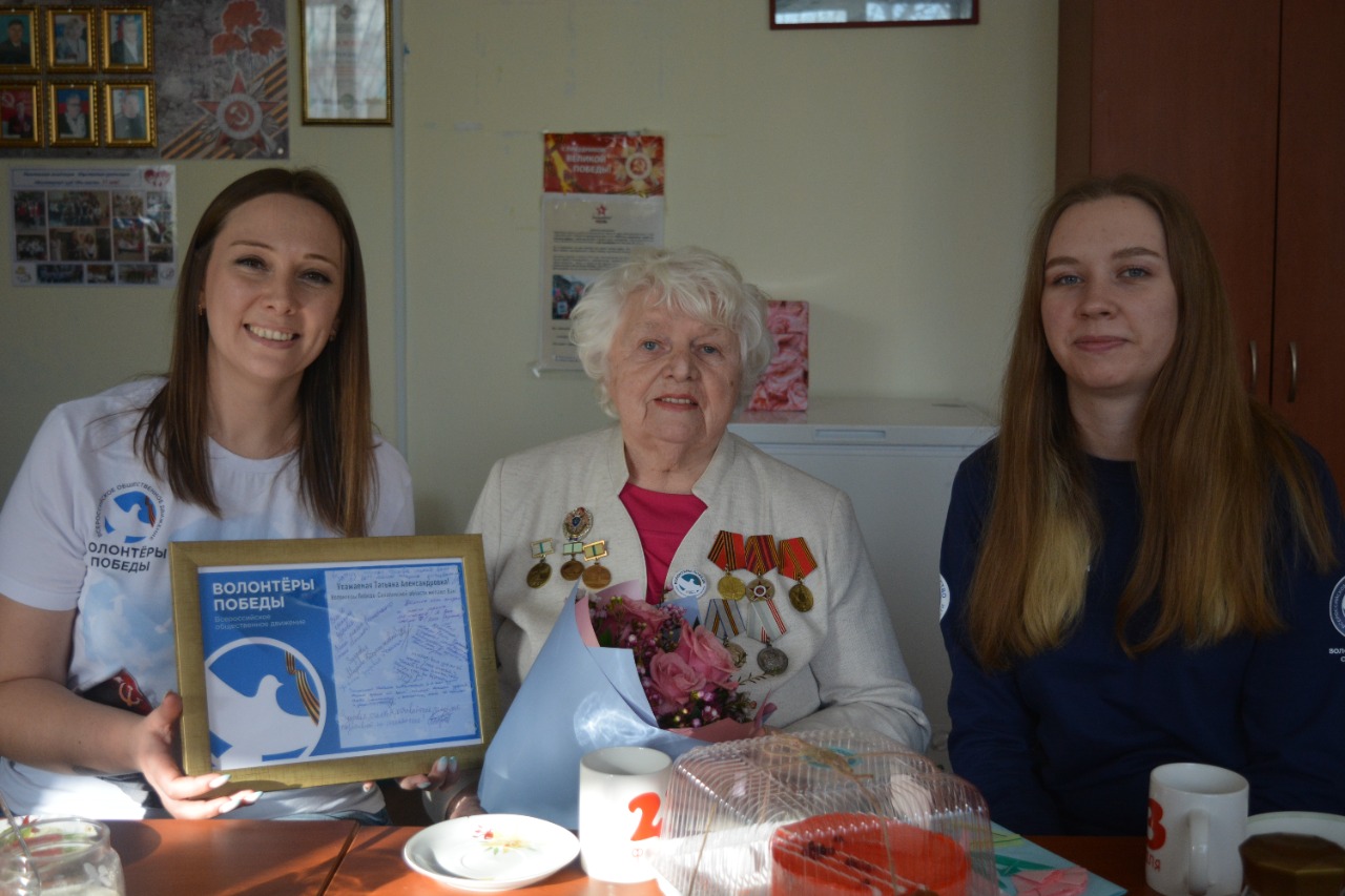 Волонтеры и молодогвардейцы вручили Татьяне Степановне письма с добрыми пожеланиями и знак «Волонтер победы».
