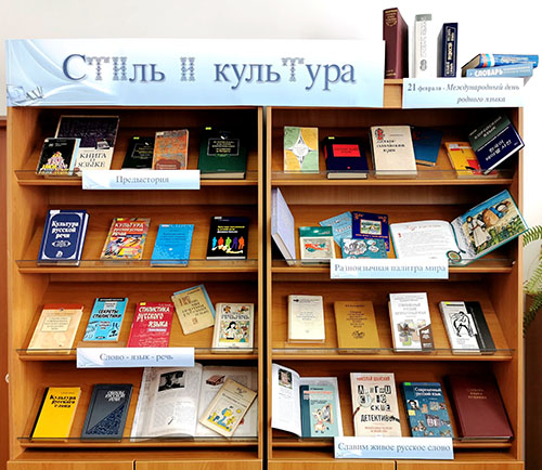 В центральной библиотеке к этой дате оформлена книжная выставка «Стиль и культура». На её полках представлены издания на языках коренных народов Сахалина, учебник латинского языка, сборник упражнений по старославянскому языку, карта языков мира. Большую часть выставки занимают книги о культуре речи и стилистике русского языка.