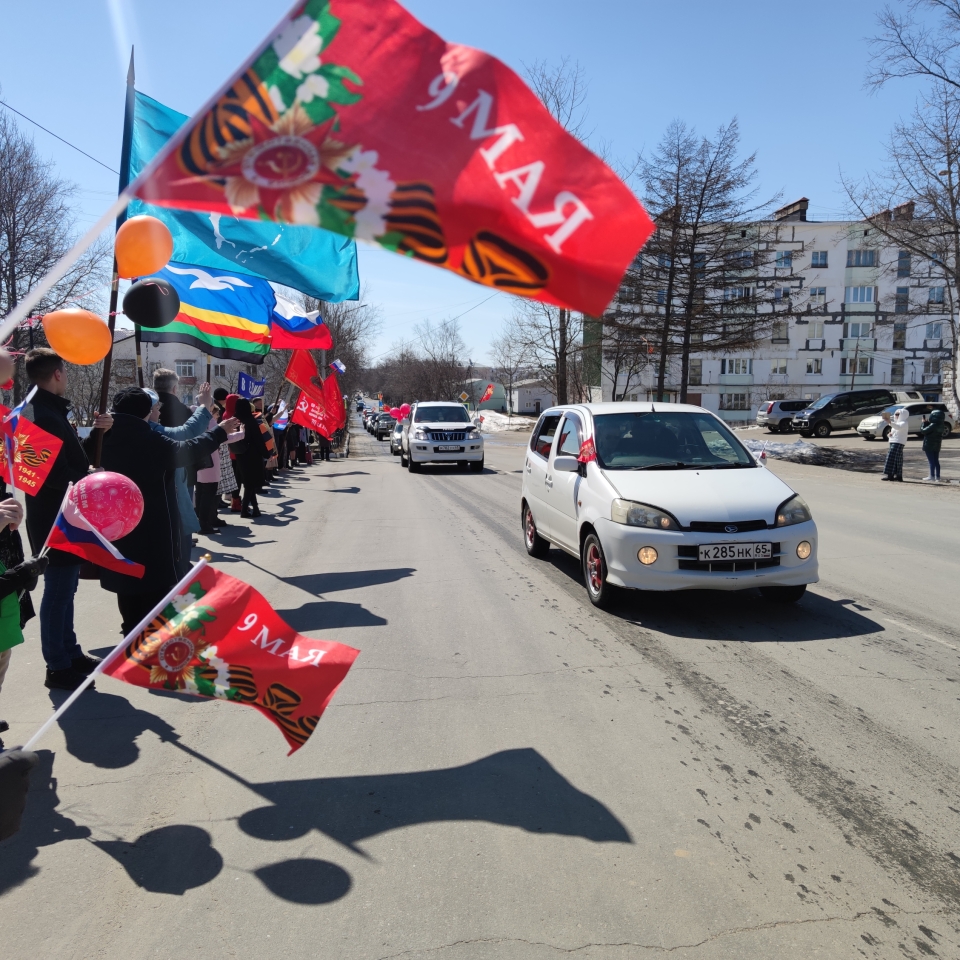 Огромная колонна машин, украшенная флагами и символикой Победы, проехала по улицам города. На протяжении всего маршрута охинцы встречали участников акции возгласами "Ура!". Колонна сигналила в ответ.