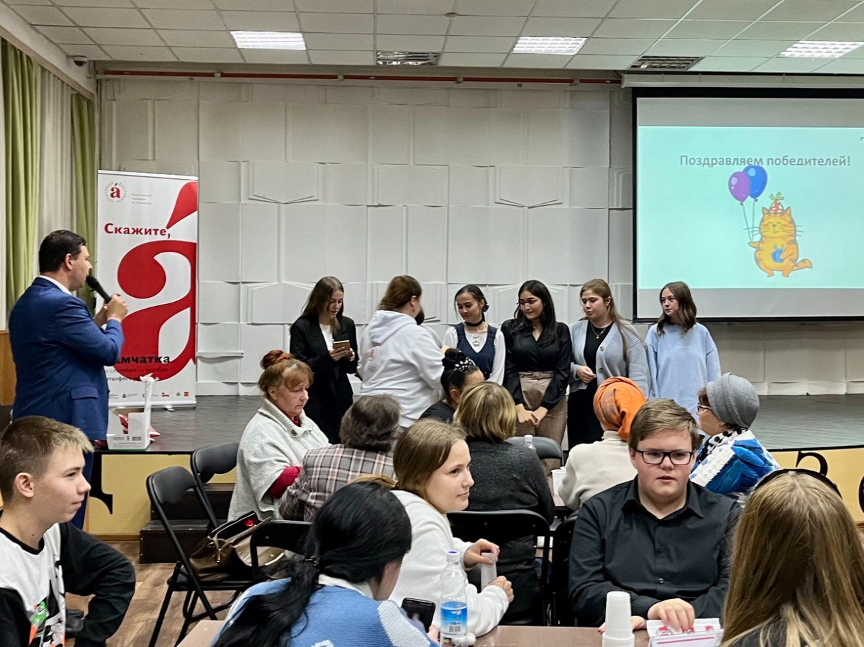 На Камчатке открылся "Тотальный фестиваль"В квизе приняли участие десять команд, в которых состязались друг с другом в знании русского языка старшеклассники, студенты, педагоги, участники клуба серебряного добровольчества "БлагоДарим" и команда клуба "MindGames".