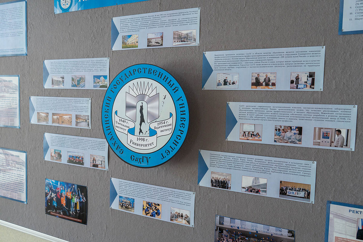 Информационный стенд знакомит читателей с основными этапами истории и развития Сахалинского государственного университета, краткой информацией о ректорах университета, научной деятельности, сотрудничестве с зарубежными университетами, конкурсах, конференциях и фестивалях, в которых участвуют студенты СахГУ, а также о проекте строительства нового студенческого городка в Южно-Сахалинске.