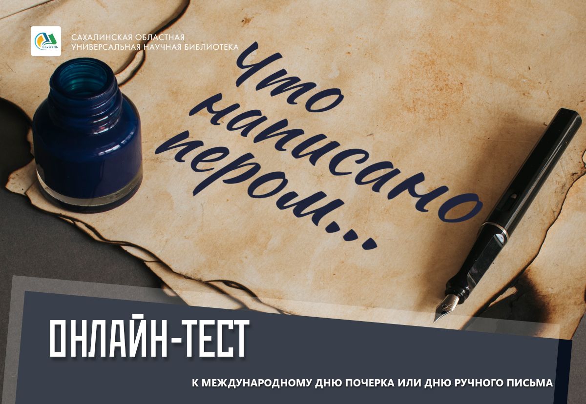 Онлайн-тест «Что написано пером…» приурочен к Международному Дню почерка или Дню ручного письма, который ежегодно отмечается 23 января. Участники теста смогут проверить свои знания, ответив на 20 тематических вопросов.