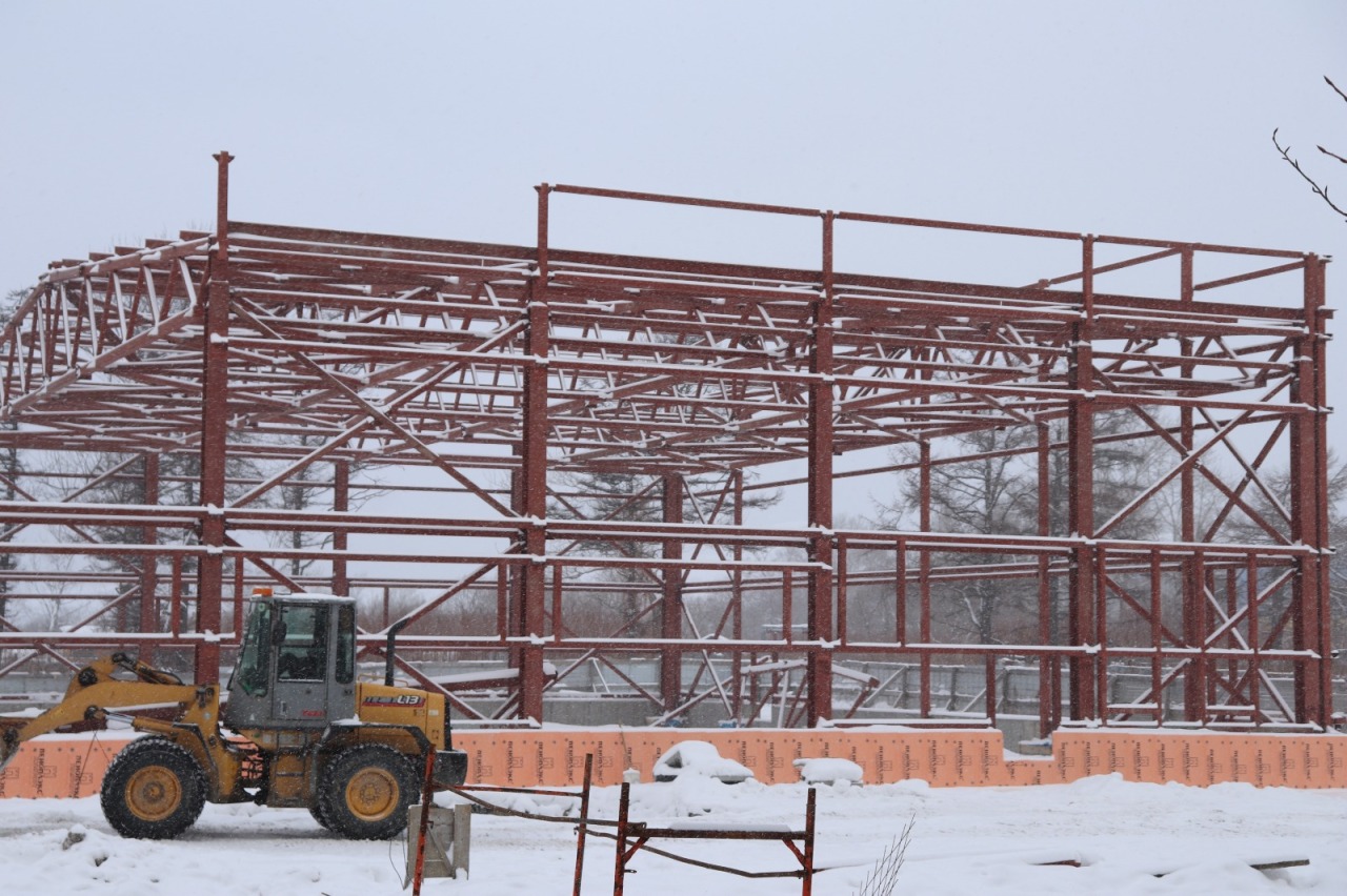 Компания-подрядчик уже закончила монтаж металлоконструкций блока, где будет располагаться спортивный зал. Одновременно ведется строительство административного здания.