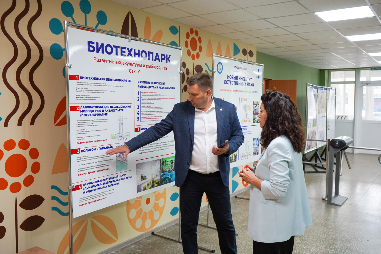 В ходе визита она ознакомилась с основными проектами и разработками вуза, осмотрела лаборатории Института естественных наук и техносферной безопасности СахГУ. Визит начался с презентации кампуса мирового уровня «СахалинTech», строительство которого стартовало в августе. Исполняющий обязанности ректора университета Александр Самардак рассказал о ключевых направлениях развития в новом кампусе, среди которых экономика Мирового океана, климат и экология, аквабиотехнологии, новая энергетика, нефтегазовые технологии и направления, связанные с изучением Азиатско-Тихоокеанского региона.