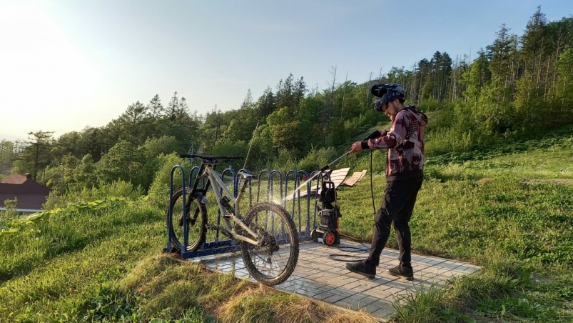 Пункты мойки велосипедов установлены на нижней и средней станциях комплекса Для удобства южносахалинцев на "Горном воздухе" оборудовали мойки для велосипедов.