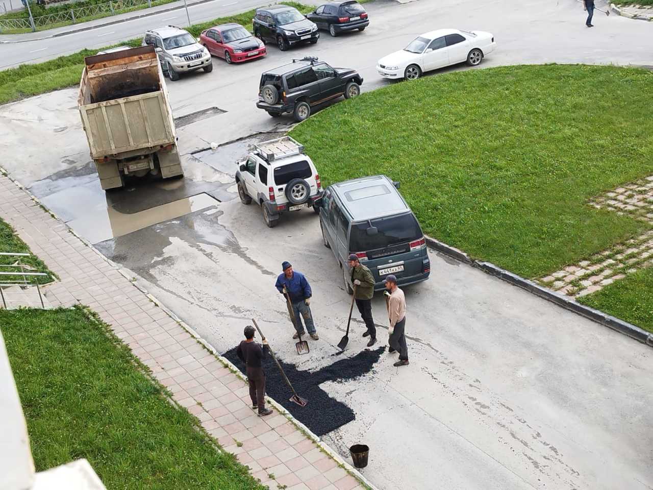 ЮЖНО-САХАЛИНСК, 16 июля, Citysakh.ru. Жители микрорайона Новое Дальнее застали дорожных рабочих за укладкой асфальта в лужи.