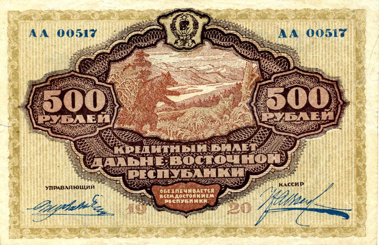 «В 1920 году впервые рубли Дальневосточной республики выпустили кредитными билетами — в 1, 3, 5, 10 рублей, затем появились купюры номиналом в 500 и 1000 рублей. Помимо этого на территории республики в торговле использовались боны правительств областей, входящих в состав ДВР, а также денежные знаки РСФСР. Однако денежной массы катастрофически не хватало. Поэтому в обращение пустили кредитные билеты американского производства в 25 и 100 рублей образца 1918 года, которые специальным образом заштамповывались во Владивостоке. При этом допускалось много ошибок — часть купюр была без подписей, цвет гербов на штампе мог быть красным, бронзовым, красно-бронзовым и даже черно-красным».Вышли из обращения дальневосточные деньги на юге Дальнего Востока только к 1922 году. На территориях, подконтрольных Дальневосточной республике, таких как Камчатка (вышла из состава ДВР в 1921 году) рублю потребовалось чуть больше времени, чтобы укрепиться.