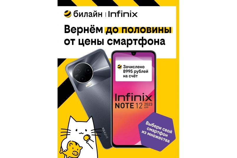 Специальное предложение распространяется на десятки моделей смартфонов брендов Infinix, Tecno, Xiaomi и realme. При оформлении покупки клиенту билайна будет возвращено на баланс телефона до половины цены устройства в виде бонусных рублей. Максимальный размер такой выгоды — 10 тысяч рублей, точный размер бонуса зависит от выбранной модели смартфона.