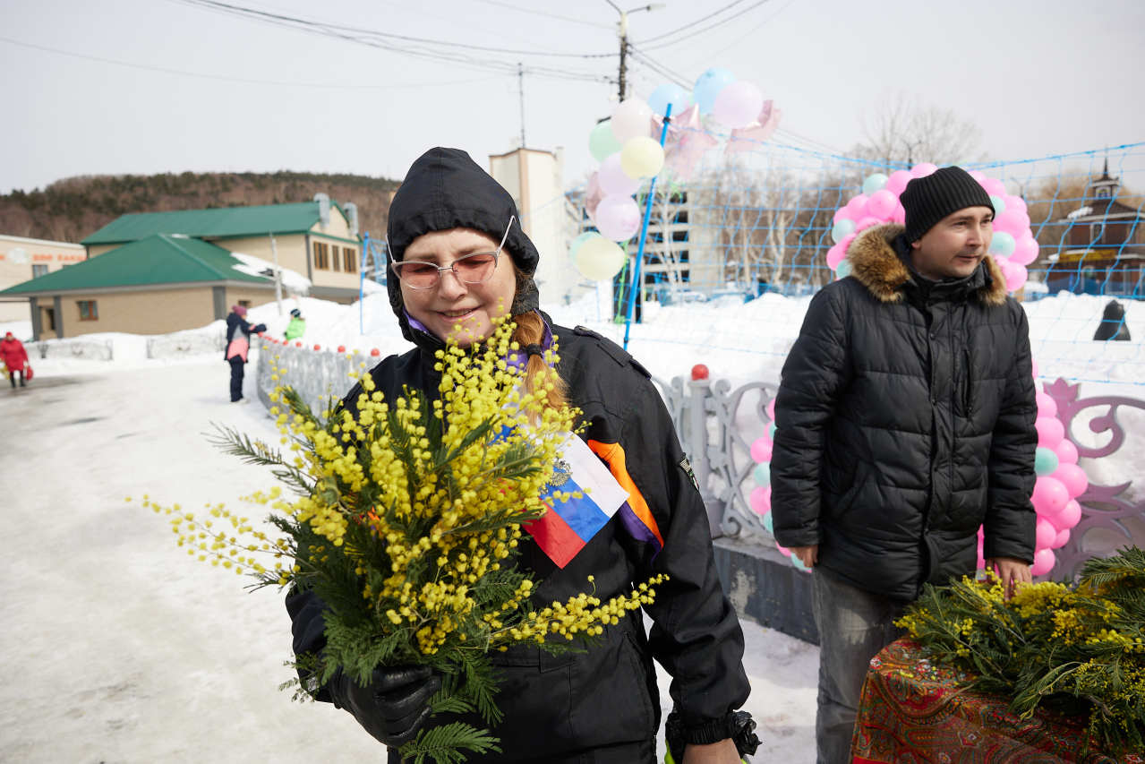 ЮЖНО-САХАЛИНСК, 8 марта, Citysakh.ru. На улицах областного центра волонтеры в праздничный день дарили женщинам веточку мимозы, теплые слова и улыбки.