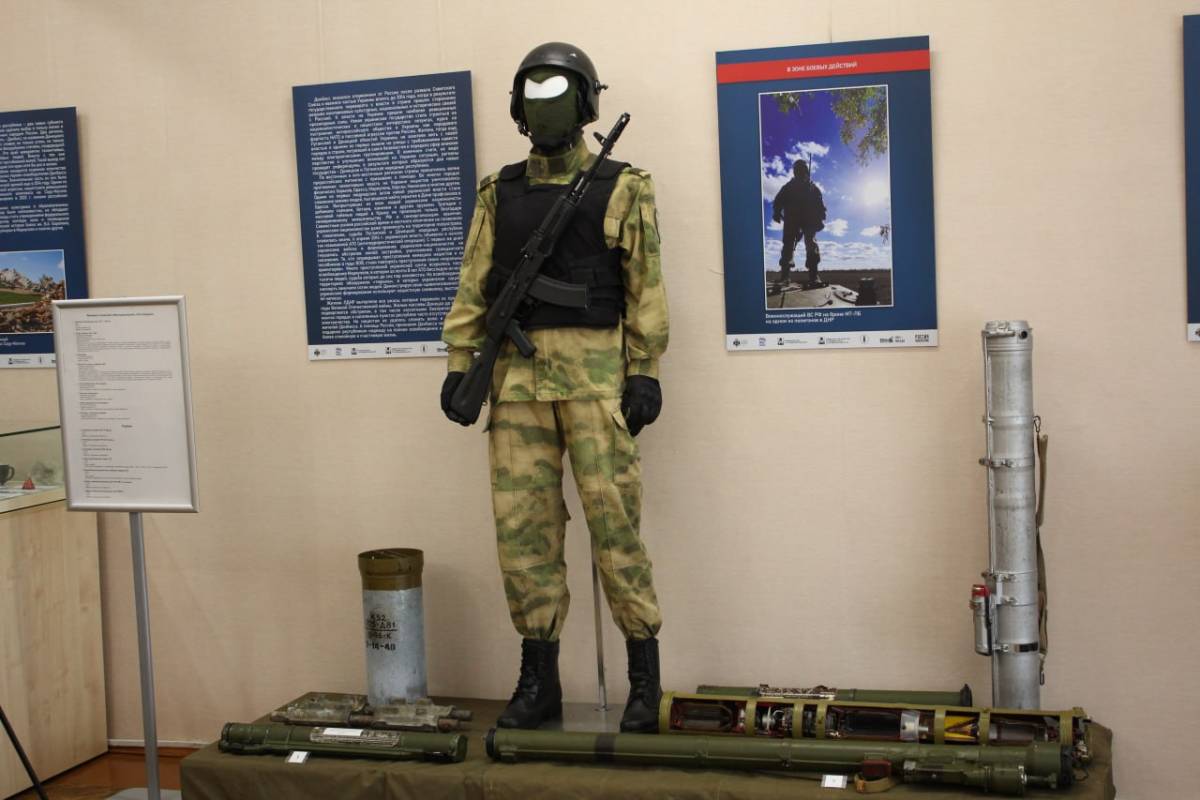 Среди экспонатов присутствуют образцы пусковых установок и современного оружия, осколки ракетных комплексов и реактивных снарядов, а также снаряжение военнослужащих и множество фотографий жителей ЛДНР и военнослужащих в зоне СВО.
