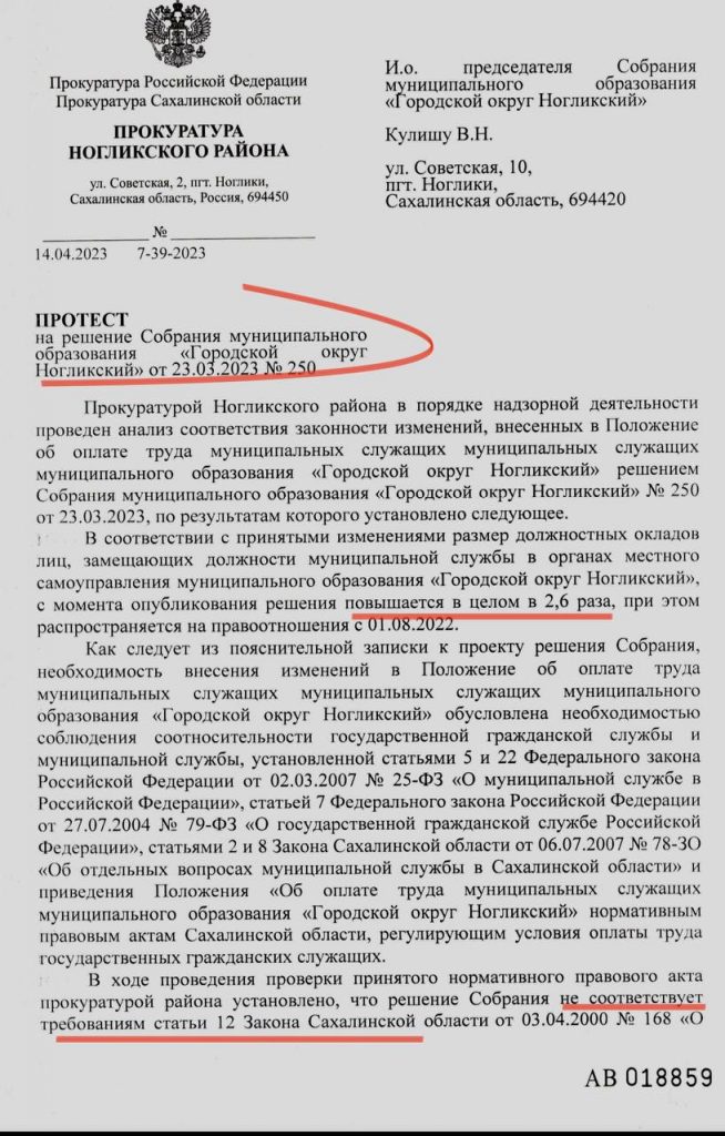 Прокуратура Ногликского района считает повышение должностных окладов в 2,6 раз необоснованным.