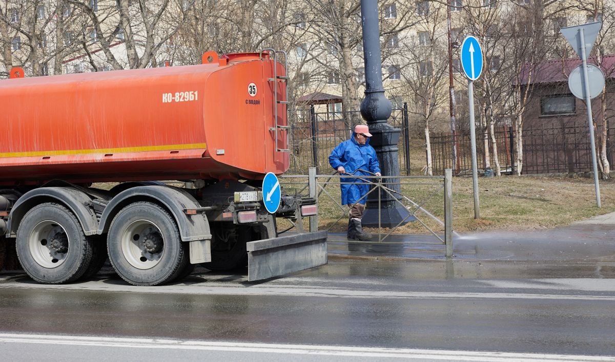 Поливомоечные работы развернуты во многих районах города. Сегодня техника работает на ул. Ленина, Сахалинской, Больничной, Авиационной, Горького, по пр. Победы, на ул. Бумажной и Фабричной. Уборка ведется практически в круглосуточном режиме, город приводят в порядок около 120 рабочих.