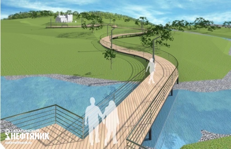 Проект предусматривает строительство пешеходной дорожки и моста через реку Охинка на свайном фундаменте, парковки с асфальтобетонным покрытием на 12 машиномест. Запланированы сети наружного освещения. Смотровая площадка и пешеходная дорожка от парковки до мостика выполняется с плиточным покрытием.