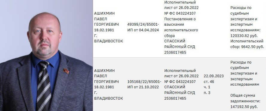 Две претензии у приставов к лидеру КПРФ Павлу Ашихмину. Уроженец Владивостока занимает пост заместителя председателя постоянного комитета Думы по государственному строительству, регламенту и местному самоуправлению. И имеет задолженности на общую сумму, превышающую 270 тысяч рублей. Причем одну из них он не гасит с 2022 года.