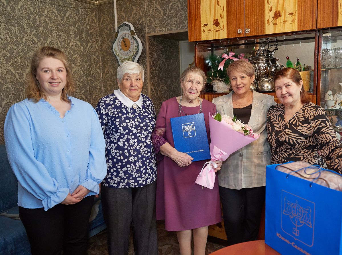 От имени мэра Южно-Сахалинска Сергея Надсадина ветерана труда Марту Фатеевну Карягину со 90-летним юбилеем поздравили представители департамента социальной политики.