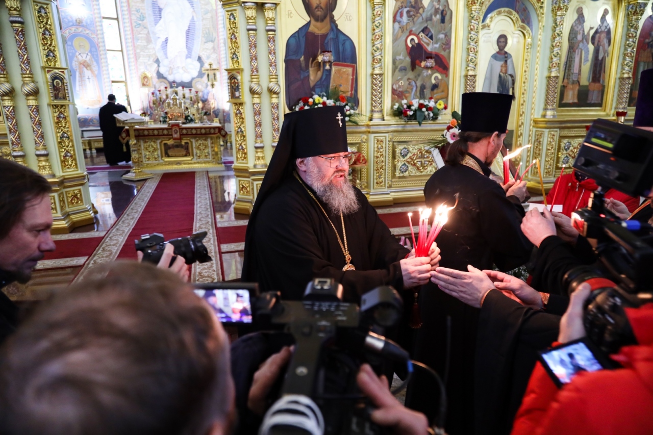 В соборе Благодатный огонь был встречен духовенством Южно-Сахалинской епархии и многочисленными верующими.