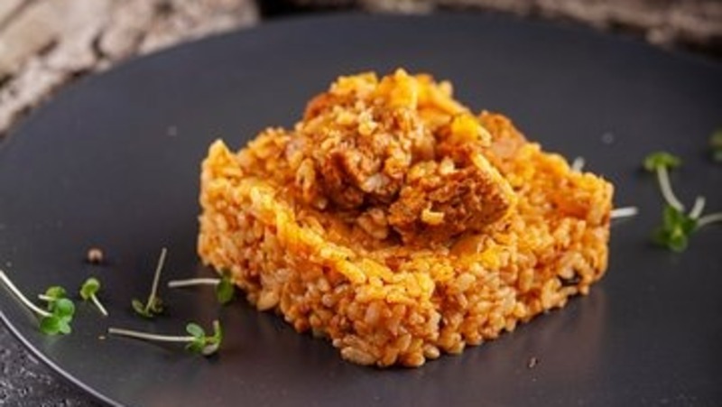 С мяса слить воду, промыть его, по необходимости порезать на более мелкие куски. В кастрюлю или мультиварку добавить мясо, рис и воду, а также соль, перец, кумин, содержимое сковороды, хорошо перемешать.