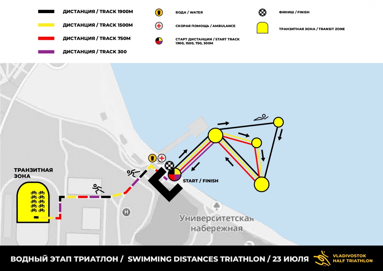 Мероприятие пройдет на о. Русский, площадкой проведения Фестиваля Триатлона выступит территория Дальневосточного федерального университета. Велосипедный этап будет проходить по визитной карточке нашего города и региона, мосту Русскому, самому длинному вантовому мосту в мире. Для наглядности каждого из этапов соревнований организаторы подготовили схемы маршрутов с обозначением точек питания, освежения и пунктов скорой помощи.