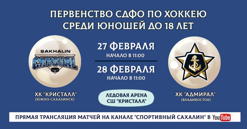27 и 28 февраля в Южно-Сахалинске пройдут матчи первенства Юниорской хоккейной лиги. «Кристалл» на своем льду принимает «Адмирал» из Владивостока. Начало игр в «Кристалле» в 11:00.