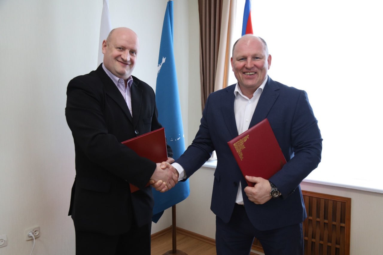ЮЖНО-САХАЛИНСК, 8 мая, Citysakh.ru. В министерстве спорта Сахалинской области состоялось подписание традиционного соглашения о сотрудничестве по развитию островного футбола. Документ скрепили подписями директор спортивной школы «Сахалин» Евгений Крючков и руководитель профессионального клуба «Сахалин» Николай Стерничук.