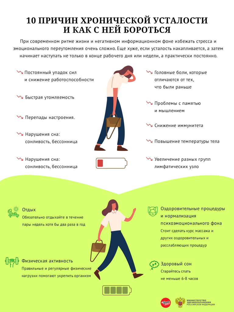 Постоянный упадок сил и снижение работоспособности. Клиническое значение имеет ухудшение самочувствия по указанным признакам более чем на 50% от нормы в течение шести и более месяцев. Быстрая утомляемость. Если действия, которые раньше не вызывали затруднений, превращаются в огромную проблему, то вам стоит обратить на это особое внимание. И это касается не только рабочих вопросов: небольшая прогулка, встреча с друзьями или даже поход в магазин могут сопровождаться усталостью. Перепады настроения. Еще одним симптомом хронической усталости могут быть скачки настроения: от полной апатии до вспышек гнева. Нарушения сна: сонливость, бессонница, не приносящий бодрости поверхностный или прерывистый сон. Головные боли, которые отличаются от тех, что были раньше, по интенсивности, характеру или продолжительности. Проблемы с памятью и мышлением: нарушение концентрации внимания, ухудшение настроения, сложности с запоминанием информации, раздражительность. Снижение иммунитета, например, частые боли в горле, обострение хронических заболеваний. Повышение температуры тела. Увеличение разных групп лимфатических узлов: шейных, подмышечных или других.Первый из перечисленных симптомов является ключевым, остальные же дополняют картину. В запущенных случаях хроническая усталость не только снижает качество жизни, но и может спровоцировать опасные для жизни ситуации. К примеру, резкое ухудшение концентрации внимания или сонливость – частая причина несчастных случаев. Именно поэтому при синдроме хронической усталости важно вовремя начать лечение.