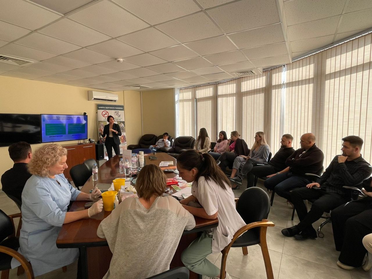 Помимо совещания, в актовом зале компании развернулась медицинская площадка, куда были приглашены все желающие, чтобы пройти скрининг на факторы риска хронических неинфекционных заболевай. Специалисты Центра общественного здоровья и медицинской профилактики измерили сотрудникам глазное и артериальное давление, определили уровень сахара и холестерина в крови. Все курящие смогли узнать уровень концентрации угарного газа в выдыхаемом воздухе на смокелайзере.